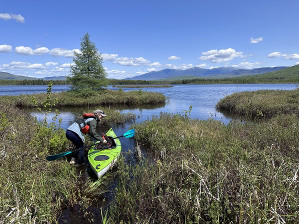 Loon Preservation Committee Biologist Michele Adams readies a kayak at Cherry Pond in Jefferson, NH before heading out to survey for nesting loons. Cherry Pond is a 120-acre natural pond in the heart of the 6,500-acre Pondicherry Division. A loon chick hatched on June 11th and was seen riding on the back of an adult. The tamarack tree behind Michele in the photo is growing on a floating bog mat. The Presidential Range of the White Mountains is in the background.