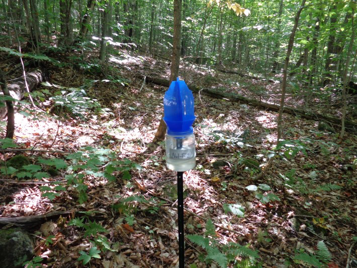 Refuge staff deployed pollinator traps within forested, wetland and grassland habitats of the Blueberry Swamp, Pondicherry and Nulhegan Basin Divisions. These blue-vane traps visually attract insects for capture in a bucket of soapy water for identification at a later date. The traps are checked every two weeks to collect the insects and record information on flowering plant species and habitat conditions. This is part of a region wide effort to inventory pollinator species on refuges, with a focus on at-risk-bees. An inventory of at-risk-bees and other pollinator species will be used to inform management of habitats to benefit these species.