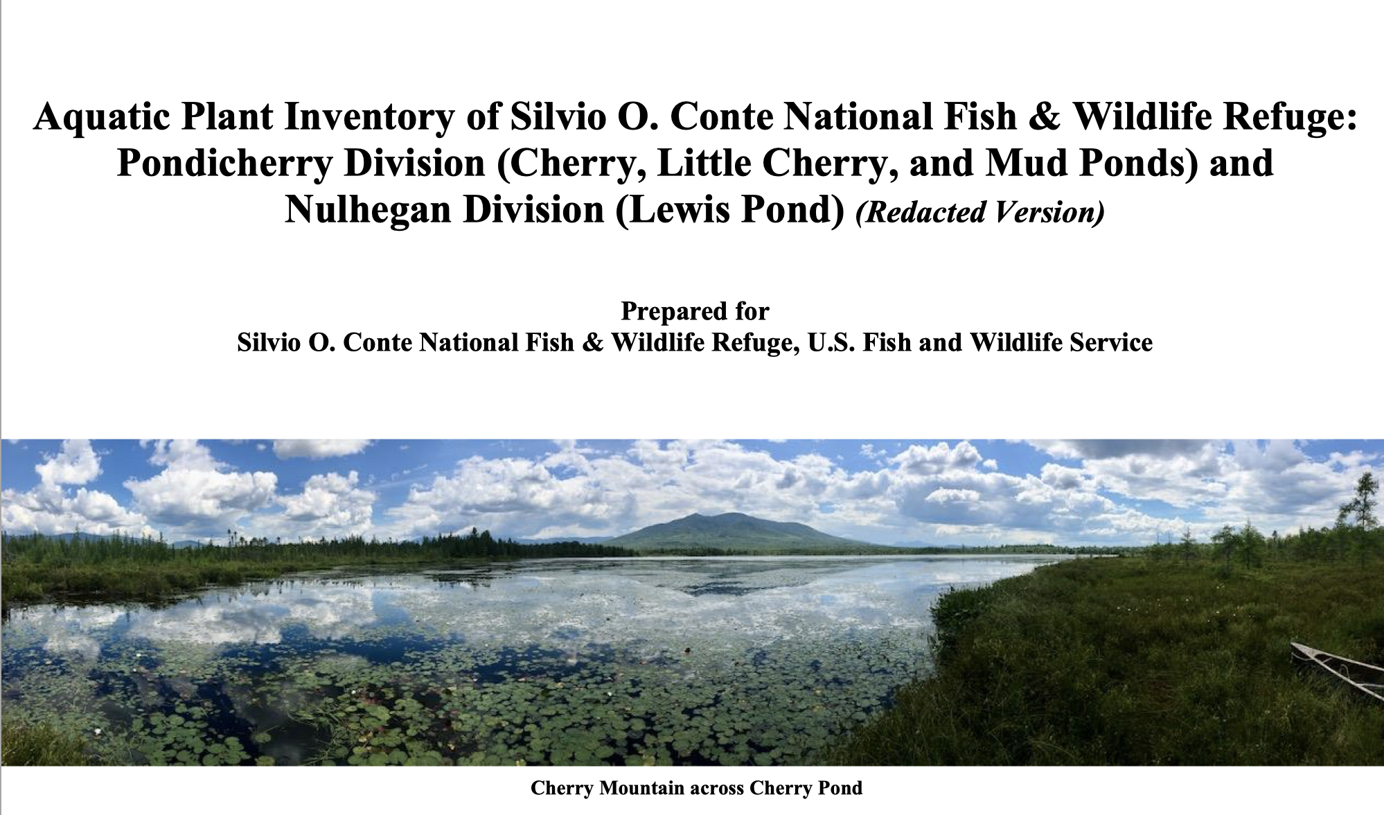 The ponds of the Silvio O. Conte National Fish and Wildlife Refuge are ecological centerpieces of both the Pondicherry and Nulhegan Divisions; however, they have received little attention in prior ecological inventories. This study fills that gap with baseline information on the aquatic flora of the Refuge ponds, including species composition, abundance, community mapping, and rare and invasive species inventories. Studied water bodies include Lewis Pond in the Nulhegan Division and Cherry Pond, Little Cherry Pond, Mud Pond, the Johns River & Deadwater (above and below Little Cherry Pond), and the small open water areas of Cedar and Moorhen Marshes in the Pondicherry Division. Fieldwork occurred over six days in late August and early September of 2022. This report version has been redacted to remove sensitive rare species data.